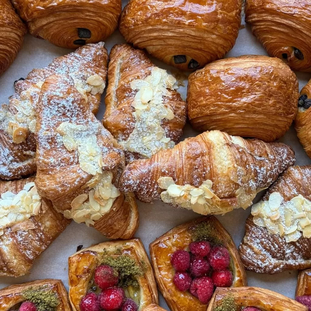 We ordered the rose latte, banana bread, almond croissant, scrambled egg toast, and strawberry matcha latte.